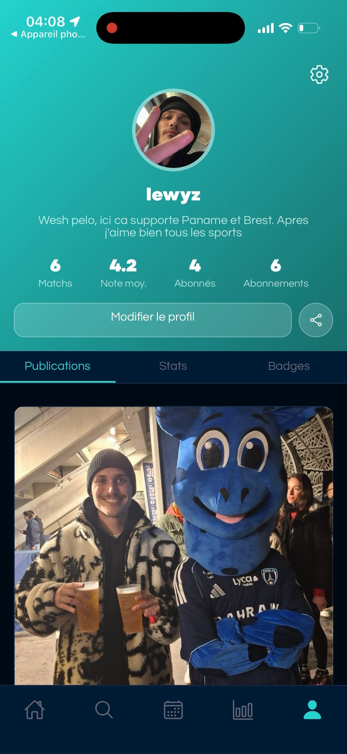 Share your matches, follow friends, collect badges. The stadium tribe.